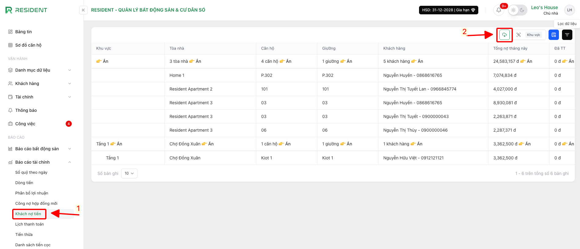 **Bước 1:** Tại màn hình Báo cáo Khách nợ tiền, ấn chọn biểu tượng **Xuất dữ liệu** (hình mũi tên màu xanh hướng xuống dưới)