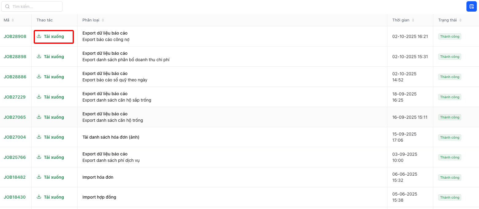 **Bước 2:** Hệ thống hiển thị màn hình lịch sử Export. Chọn Tải xuống file dữ liệu