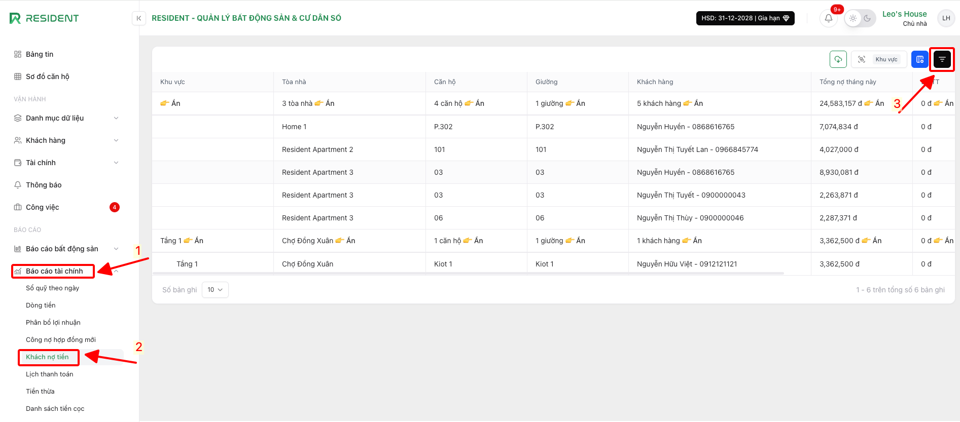 * Theo dõi tình trạng thanh toán của từng khách hàng (cư dân/tổ chức) theo từng phòng, từng tòa nhà.