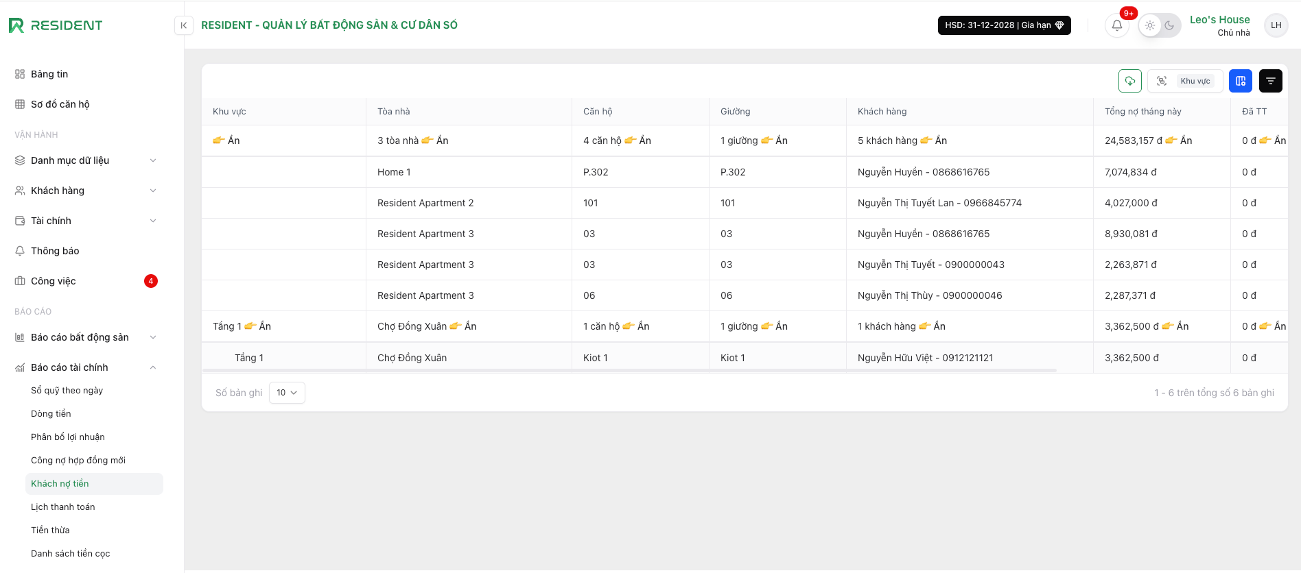 * Chăm sóc khách hàng: Gọi điện, gửi Zalo/SMS nhắc nhở các khách còn nợ.
