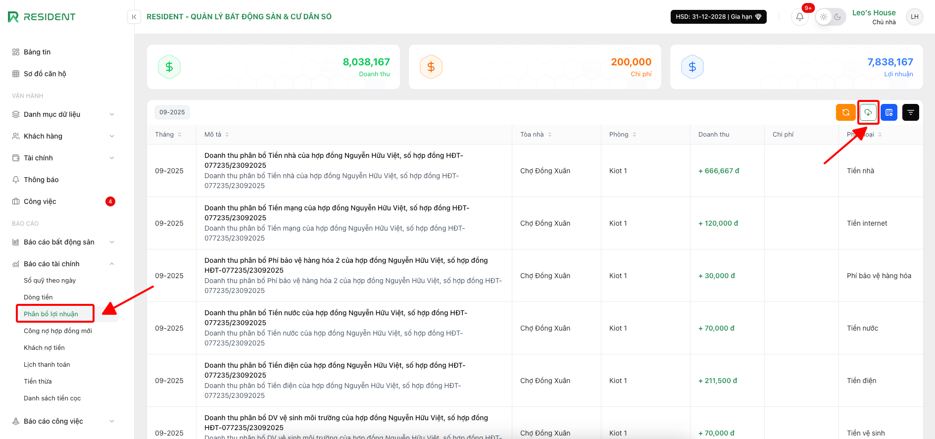Báo cáo phân bổ lợi nhuận trong phần mềm Resident giúp chủ nhà ghi nhận và theo dõi doanh thu – chi phí được phân bổ theo từng kỳ, đảm bảo phản ánh đúng lợi nhuận thực tế hàng tháng. Nhờ vậy, số liệu trở nên minh bạch, dễ dàng đối soát và lập kế hoạch tài chính.
