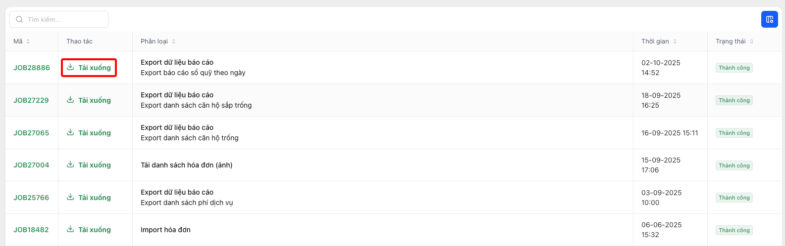* Sau khi click vào nút này, hệ thống sẽ chuyển sang màn Lịch sử Import/Export. Bạn hãy nhấn nút Tải xuống tại dòng dữ liệu muốn tải và Lưu về máy.&#x20;