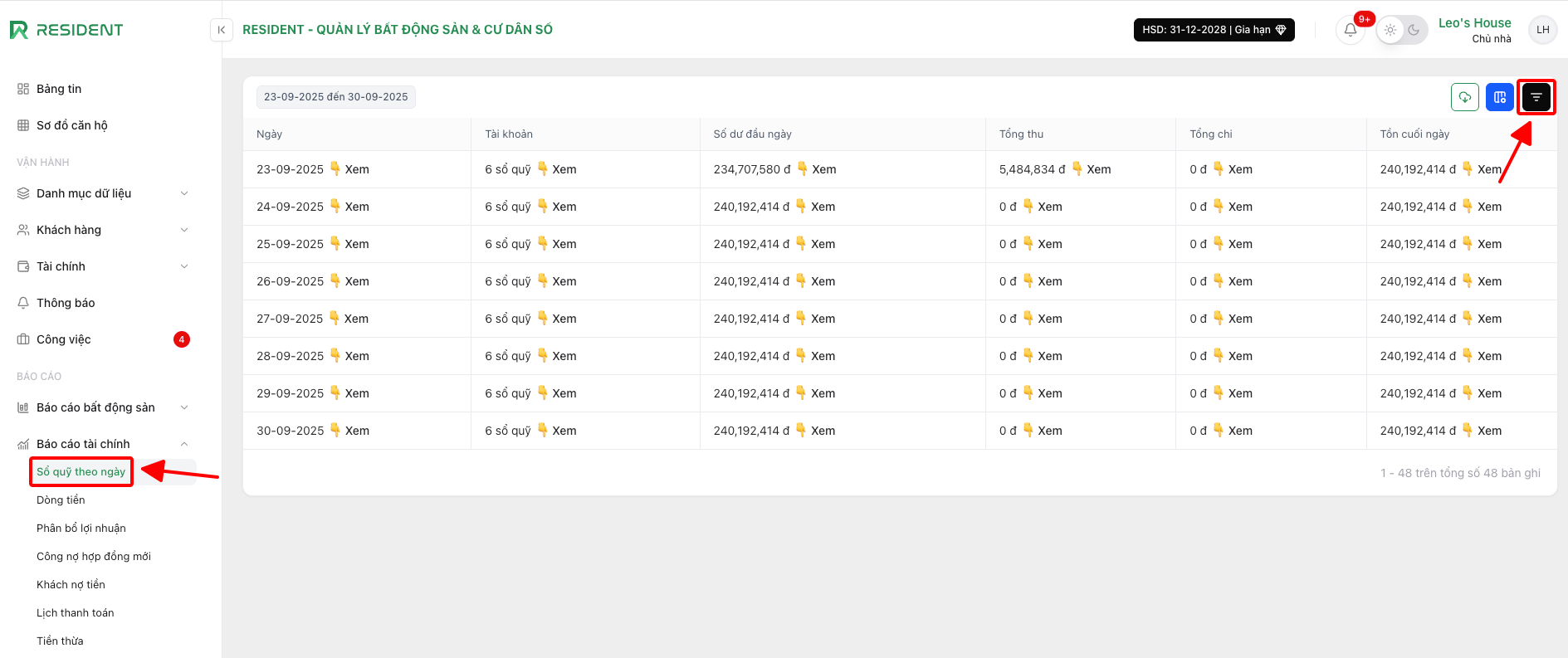 Màn hình **Sổ quỹ theo ngày** cho phép theo dõi chi tiết tình hình thu – chi và số dư quỹ của từng tài khoản (tiền mặt, ngân hàng, ví,…) theo từng ngày. Đây là công cụ quan trọng để chủ nhà quản lý dòng tiền hằng ngày một cách minh bạch, chính xác.